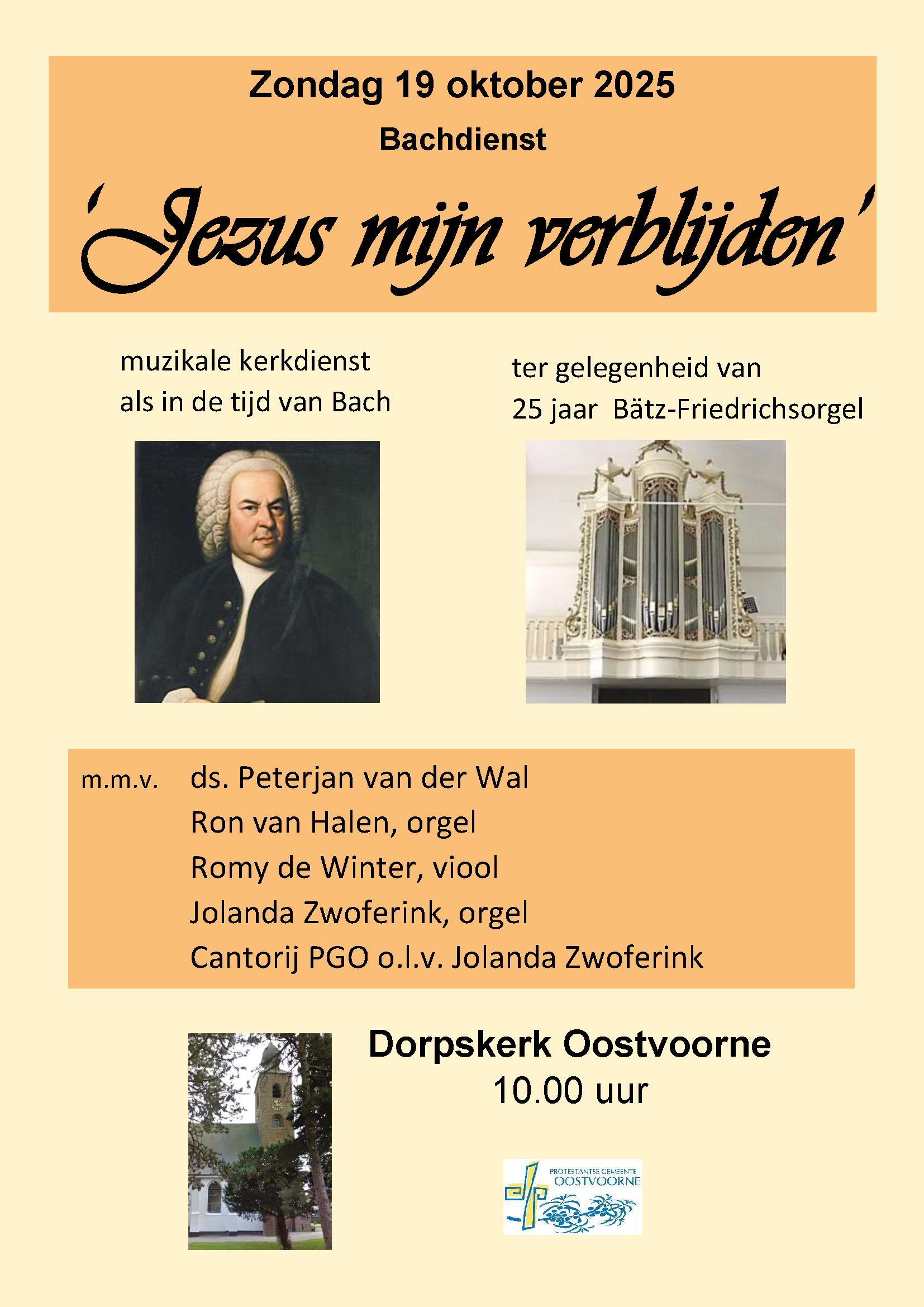 Ter gelegenheid van vijfentwintig jaar Bätz-Friedrichsorgel wordt op zondag 19 oktober om 10.00 uur een ‘Bachdienst’ gehouden in de Dorpskerk van Oostvoorne.
