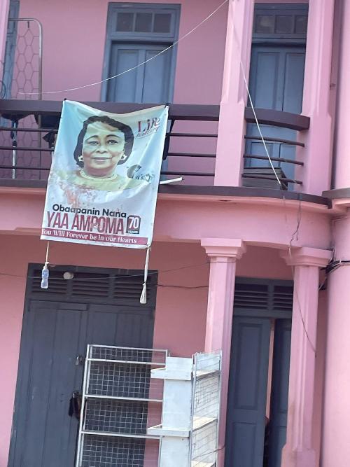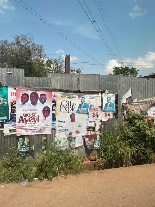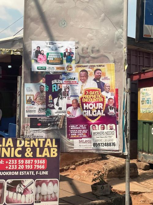 Wie veel geld heeft, kan natuurlijk bericht op een flinke billboard betalen. Kleinere beurzen moeten het doen met posters of postertjes op hekken en lantaarnpalen. Maar altijd staat er een foto op van de overledene, en heel vaak ‘called to glory’ erbij, wat ik een prachtige, hoopvolle tekst vindt. De poster achterop de bus waarin wij rondrijden is minder blijmoedig: ‘painfull exit’, dat betekent een dodelijk ongeluk. Het was een bekende van onze chauffeur, zei hij desgevraagd opgewekt. We rijden dus al een hele week met deze mobiele rouwkaart door Ghana.