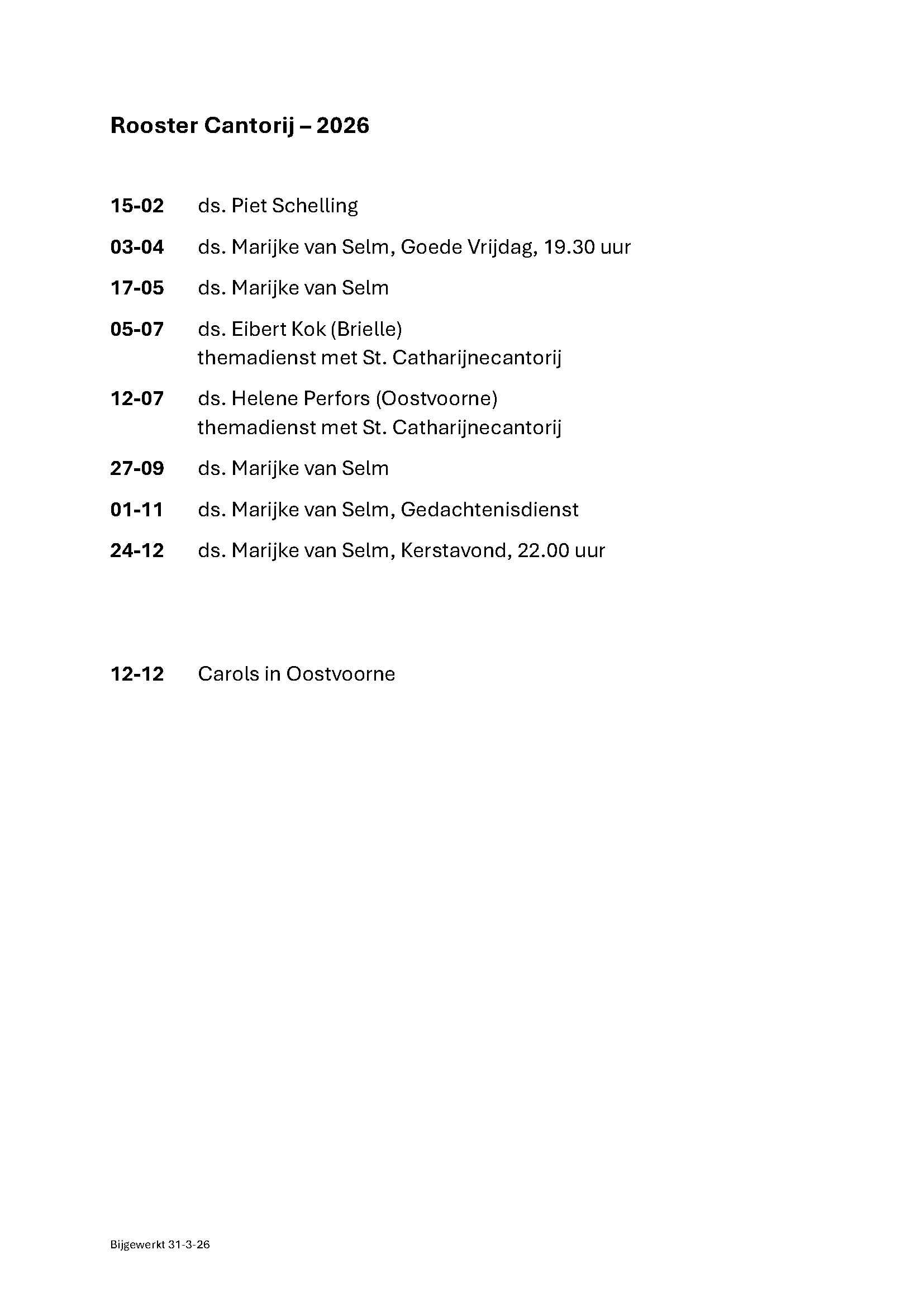 Onderstaand het rooster van de cantorij voor 2026