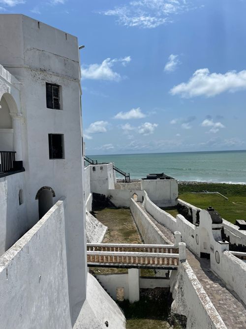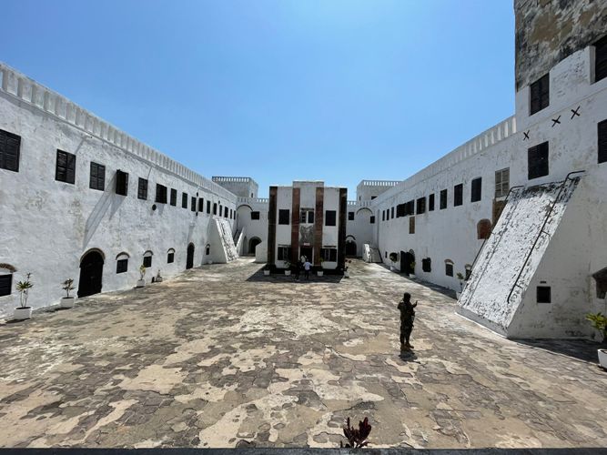 We staan in een lage kelderachtige ruimte van 4 bij 15 meter. Hier, zegt de gids, waren 150 vrouwen en meisjes opgesloten. Er was geen water, geen wc, ze zaten hier weken en soms maanden achtereen. Stel je voor hoe dat moet zijn geweest. Ik stel het me voor. Ik stel me ook voor hoe je van hieruit de andere ruimtes kon zien, rondom de binnenplaats, afgesloten door tralies, ik stel me voor hoe de jonge vrouwen, opgesteld op de binnenplaats, vanaf het balkon op de verdieping boven hen, gekeurd werden door de directeur-generaal van de West Indische Compagnie, hoe de mooiste meisjes eruit gehaald werden en naar boven gebracht voor persoonlijk gebruik op die bovenverdieping waar alles ruim en licht is en het uitzicht over de oceaan fenomenaal.