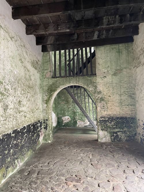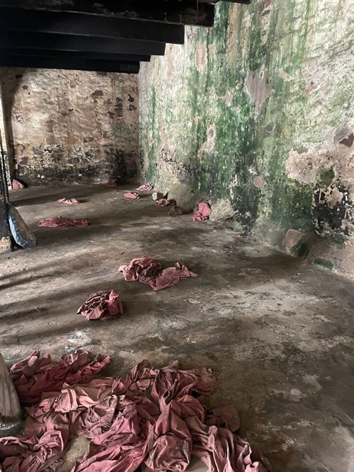 Door de nauwe gangen van de mannenafdeling lopen we naar de plek vanwaar de slaven verscheept werden. Kort voor het einde is er een tussendoorgangetje waardoorheen de vrouwen erbij gevoegd werden. Echtparen en familieleden konden elkaar daar nog één keer treffen voordat ze, met z’n zevenen aan elkaar geketend, verscheept werden over de wereldzeeën om nooit meer terug te komen.