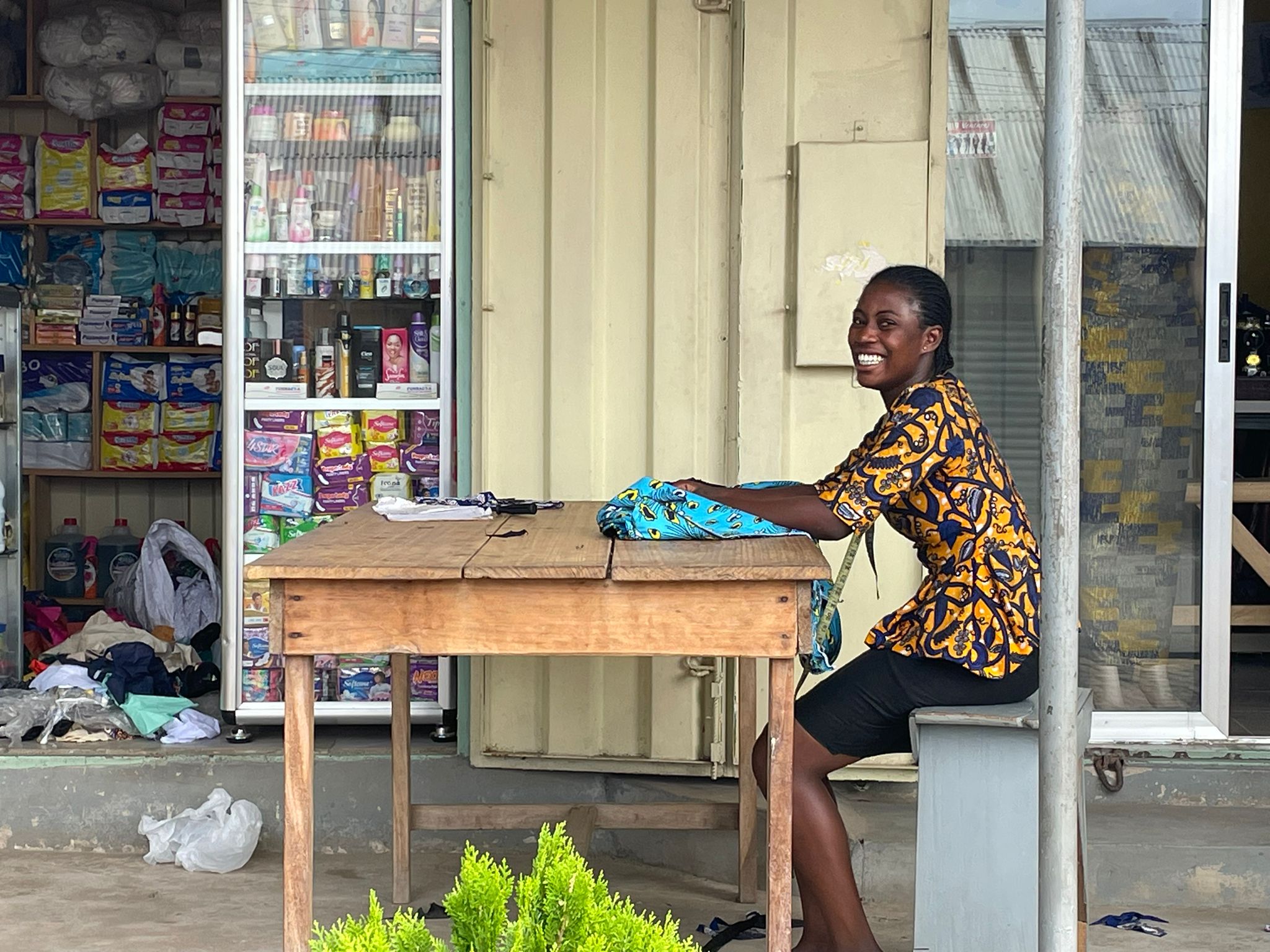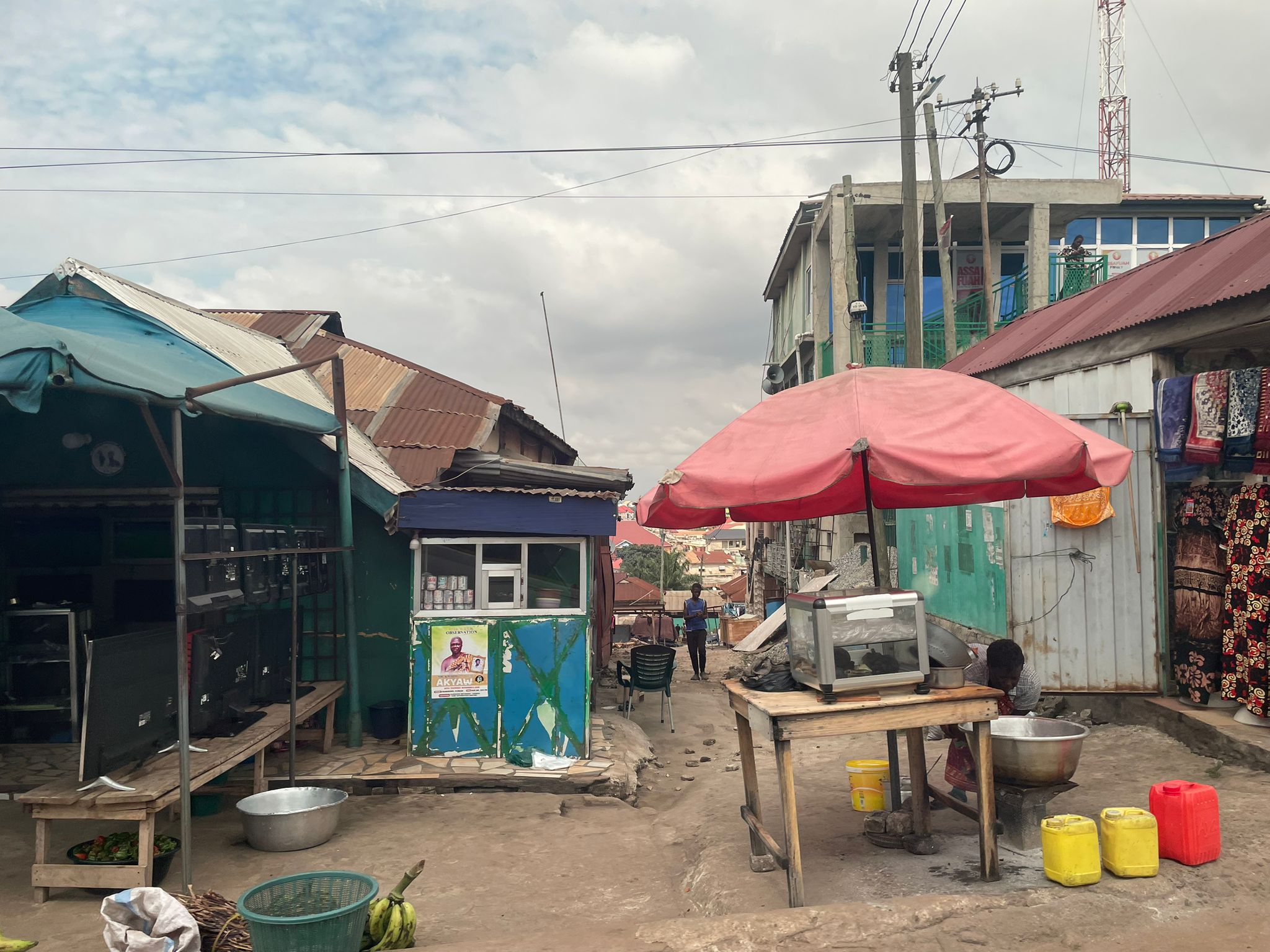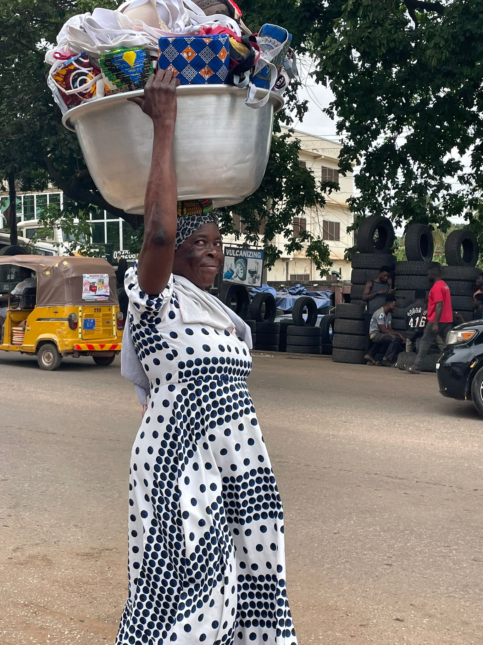 We logeren in een eenvoudig hotel in een rustige buurt. Ook hier zijn er de nerinkjes en de kleine ambachtszaakjes, soms niet meer dan een hokje met een dak, waar dan een kapper zit of een naaiatelier. En ook hier meteen om de hoek zijn de wegen onverhard en vol afval. Maar het is allemaal niets vergeleken met sloppenwijk Old Tafo, waar het verkeer stinkend door elkaar krioelt: volgepropte minibusjes, overladen vrachtwagens, brommers en scooters, uit India geïmporteerde riksja’s en mensen die op magische wijze van alles op hun hoofd transporteren. Vooral de vrouwen doen dat. Aan weerszijden van de doorgaande wegen kijk je tussen de talloze kraampjes en winkeltjes door zo de sloppen in, stoffige paadjes vol kuilen, met een geul in het midden voor als het regent.