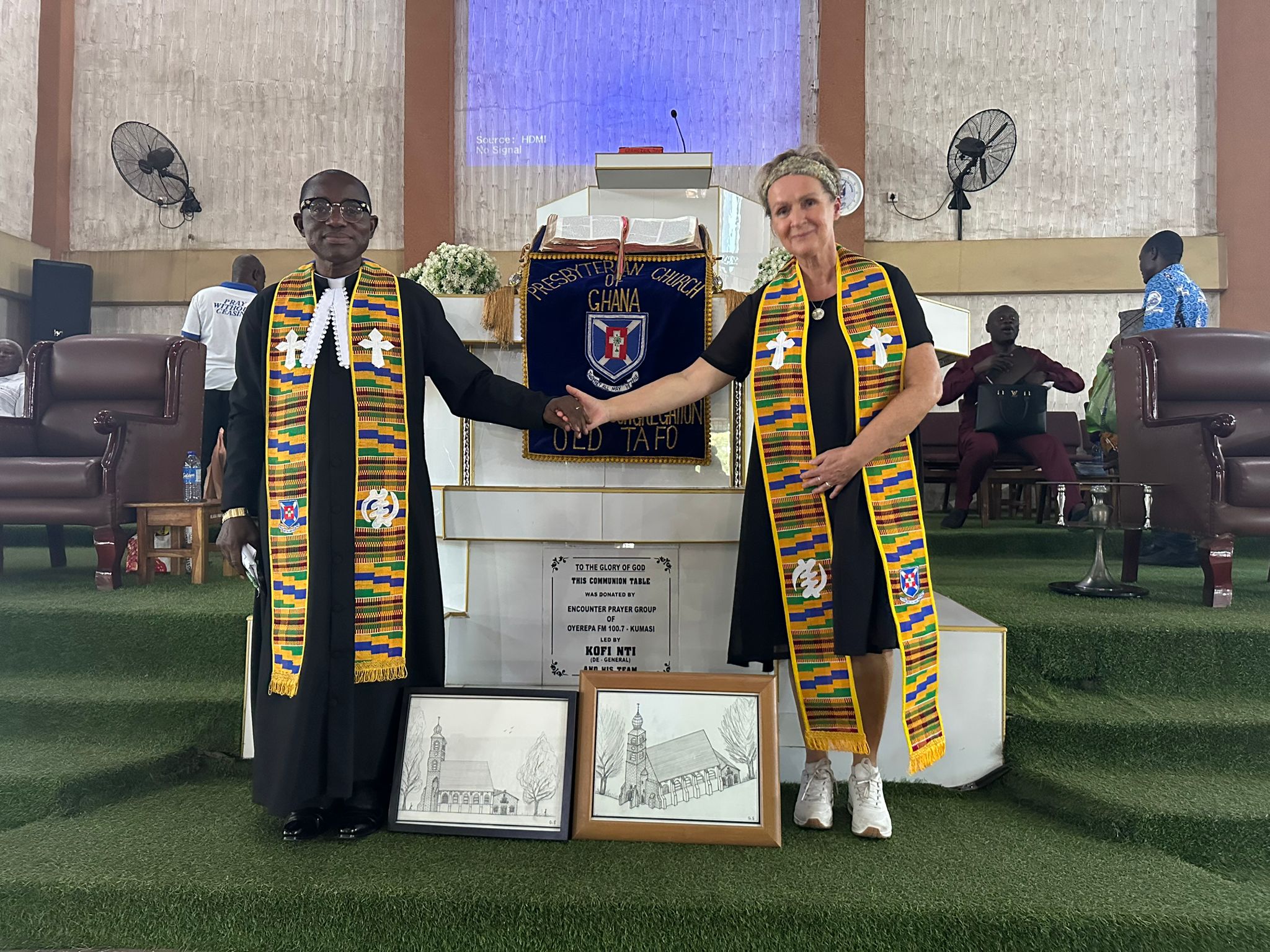 Na de preek, galmend voorgedragen, en nog meer zingen en bidden, waren er cadeaus: een overhemd voor de mannen, en een jurkje voor Simone en mij van stof met het logo van de Presbyterian Church of Ghana erop. Dat klinkt echt hilarisch en dat is het ook, maar hier is het minder gek dan je denkt. De kinderen op de school hebben feestuniformen met de gezichten van de founders van de school, de gids in het Ashanti Museum afgelopen week droeg een blouse met dáárvan de founders erop. Dit is Ghana, de mensen doen hier dingen anders. De eerlijkheid gebied mij te zeggen dat ik vrees dat ik het jurkje niet veel zal dragen. Maar dat geldt niet voor de stola die ik cadeau kreeg. Daar ben ik (ook) heel blij mee, en ik ben voornemens om hem meteen, volgende week, bij de bevestiging van Sandra, te dragen. Een stola uit Ghana bij de bevestiging van een diaken. Hoe mooi wil je het hebben.